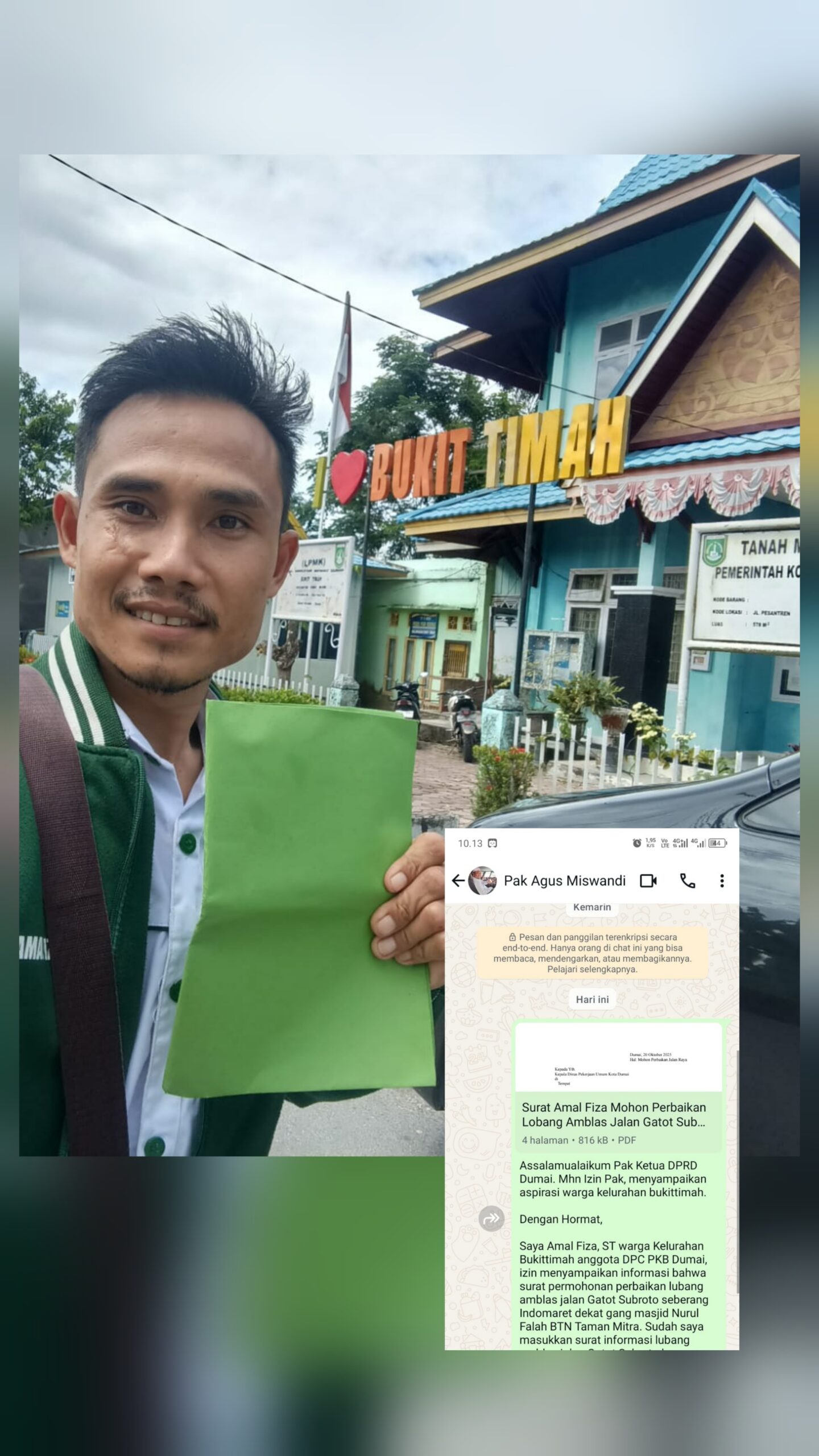 Sebagai bentuk keseriusan, salinan surat tersebut juga diantarkan langsung ke Kantor Lurah Bukit Timah, serta disampaikan kepada Ketua Anggota Dewan Perwakilan Rakyat Daerah (DPRD) Kota Dumai, Bapak Agus Miswandi, melalui pesan WhatsApp, guna memperkuat koordinasi dan percepatan tindak lanjut penanganan jalan amblas tersebut.