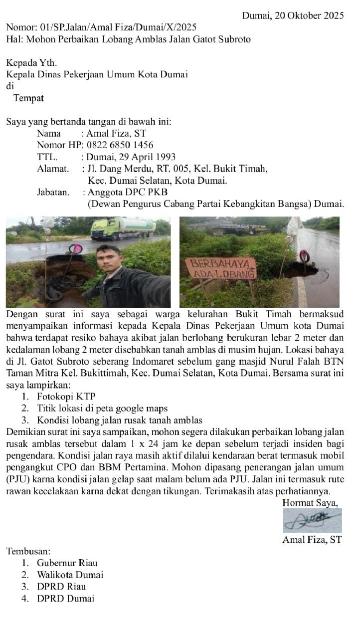 Dalam surat resmi yang dikirimkan kepada Kepala Dinas PU, Amal Fiza menjelaskan bahwa lubang jalan dengan lebar sekitar 2 meter dan kedalaman mencapai 2 meter tersebut sangat berpotensi menimbulkan bahaya bagi pengendara, terutama pada malam hari. Kondisi ini terjadi akibat tanah amblas karena curah hujan tinggi yang melanda wilayah Dumai beberapa hari terakhir.