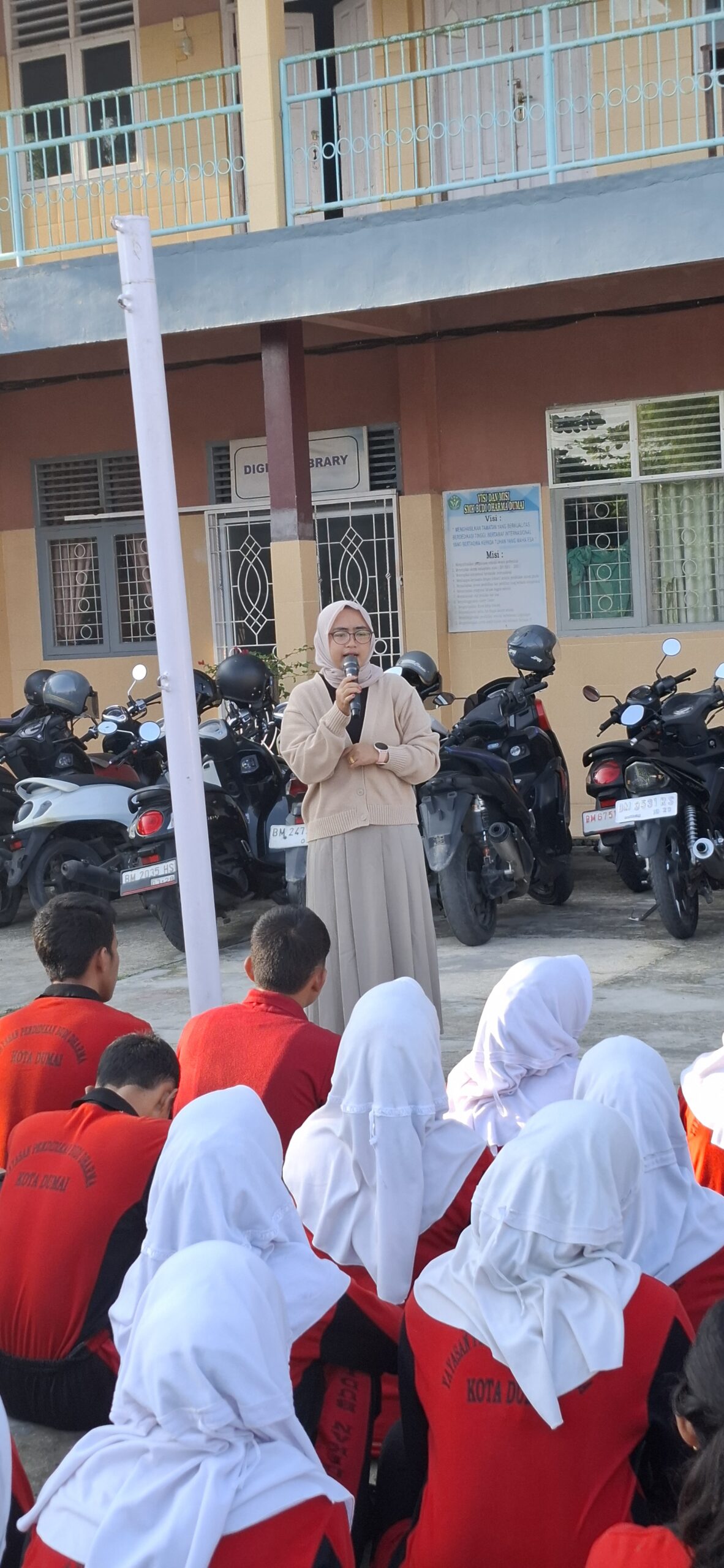 (Photo Ibu Indah Kurnia Sari S. Pd., Memberikan Pengarahan pada Apel Pagi Sabtu di SMKS Budi Dharma Dumai)