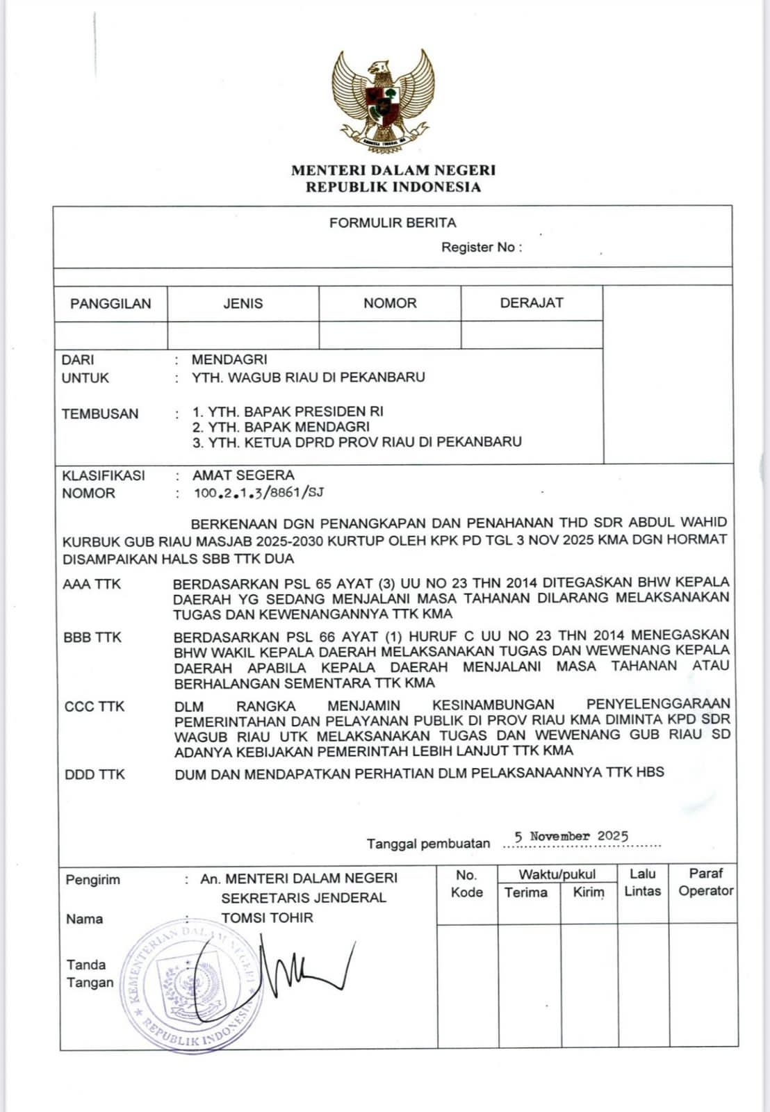 Dumai – Pekanbaru – Jakarta, 5 November 2025 — Kementerian Dalam Negeri (Kemendagri) Republik Indonesia mengeluarkan surat resmi dengan klasifikasi “Amat Segera” bernomor 100.2.1.3/8861/SJ, yang ditujukan kepada Wakil Gubernur Riau di Pekanbaru. Surat tersebut menindaklanjuti penangkapan dan penahanan Gubernur Riau, Abdul Wahid, oleh Komisi Pemberantasan Korupsi (KPK) pada 3 November 2025.
